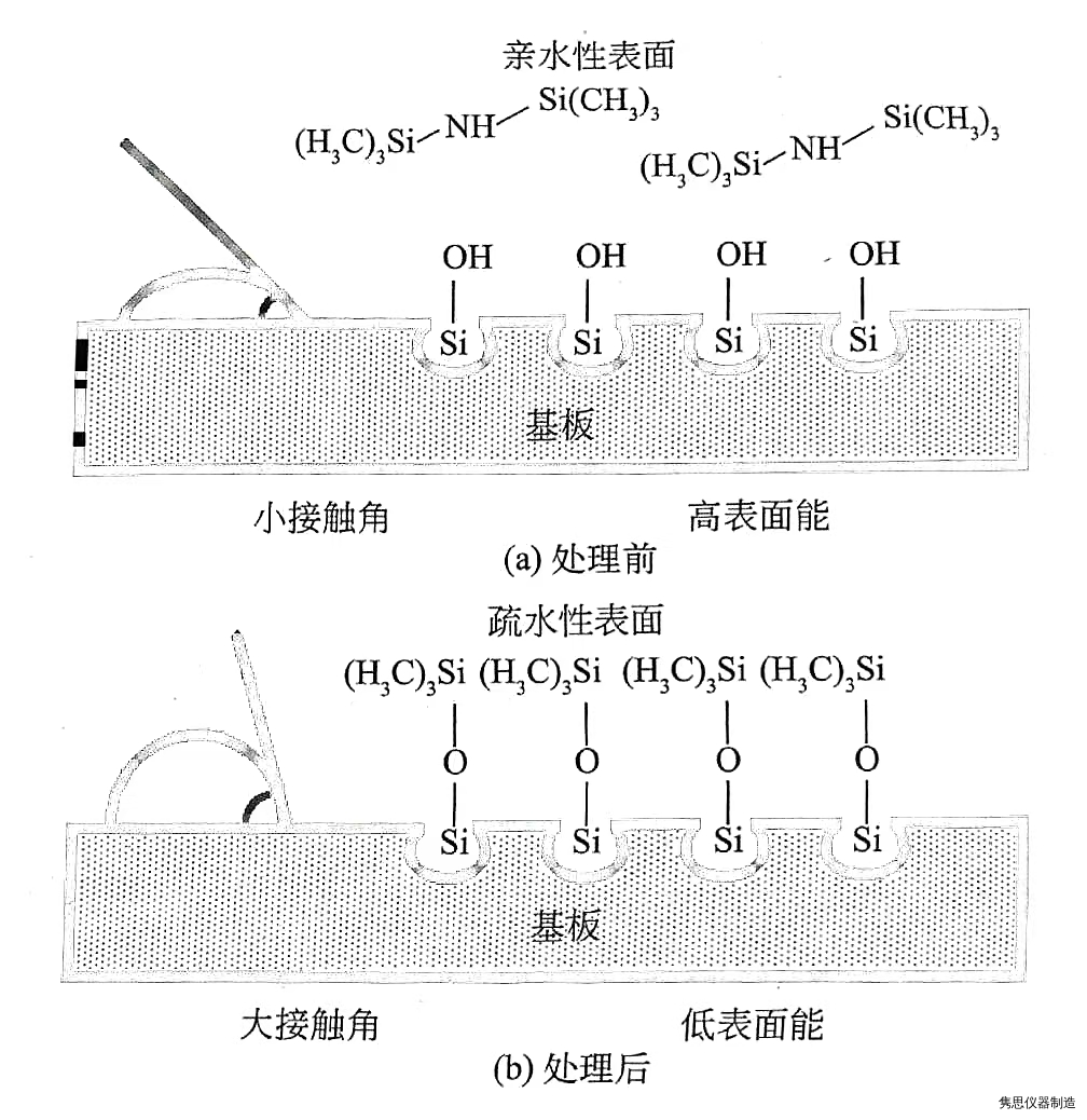 为了使光刻胶的涂覆性更好,需用六甲基二硅氮烷(HMDS)对晶圆进行处理。特别是当Si氧化膜表面附着了水分,形成了硅醇等降低了光刻胶的黏结力情况下。为除去水分和分解硅醇,通常将晶圆加热至100~120℃,导入雾状HMDS,使之发生化学反应,反应机理如图1所示。HMDS真空烘箱系统通过HMDS处理,亲水性和接触角小的表面变成疏水性和接触角大的表面。加热晶圆可以获得更高的光刻胶黏结力。