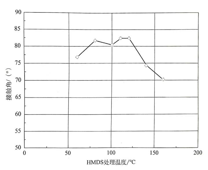 通过测量接触角可以观察HMDS处理效果。图2所示是HMDS处理时间与接触角的关系,基板是Si,HMDS处理时间大于1min,接触角大于80℃,处理效果稳定。图3所示,是HMDS处理温度与接触角的关系,当温度超过120℃时,接触角降低,这表明HMDS受热分解。因此,通常在100~110℃温度下进行HMDS处理。